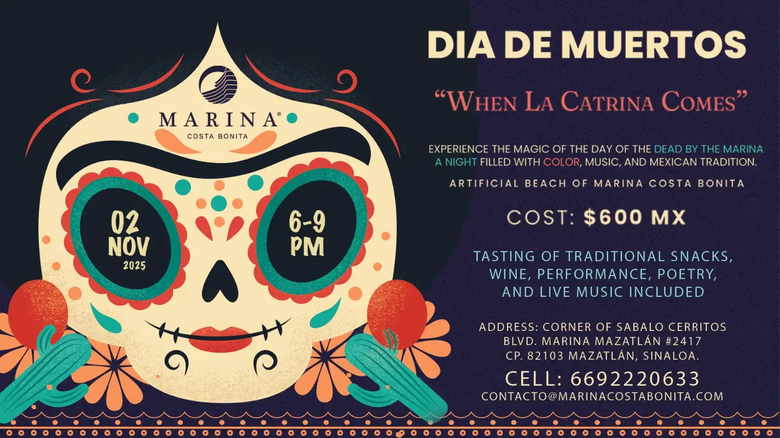This November 2nd, from 6 to 9 p.m., Marina Costa Bonita invites you to experience the true spirit of Día de Muertos by the sea — a night filled with color, music, and Mexican tradition, all set on the artificial beach of Marina Costa Bonita in Mazatlán’s beautiful Cerritos area.