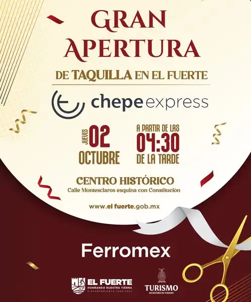 El Fuerte, Sinaloa.— The iconic Chepe Express, one of Mexico’s most scenic train journeys, has officially announced the opening of a ticket office in El Fuerte, marking a milestone for the municipality and its tourism sector. The inauguration will take place on Thursday, October 2nd, at 4:30 p.m. in the Historic Center of El Fuerte, at the corner of Montesclaros and Constitución streets.