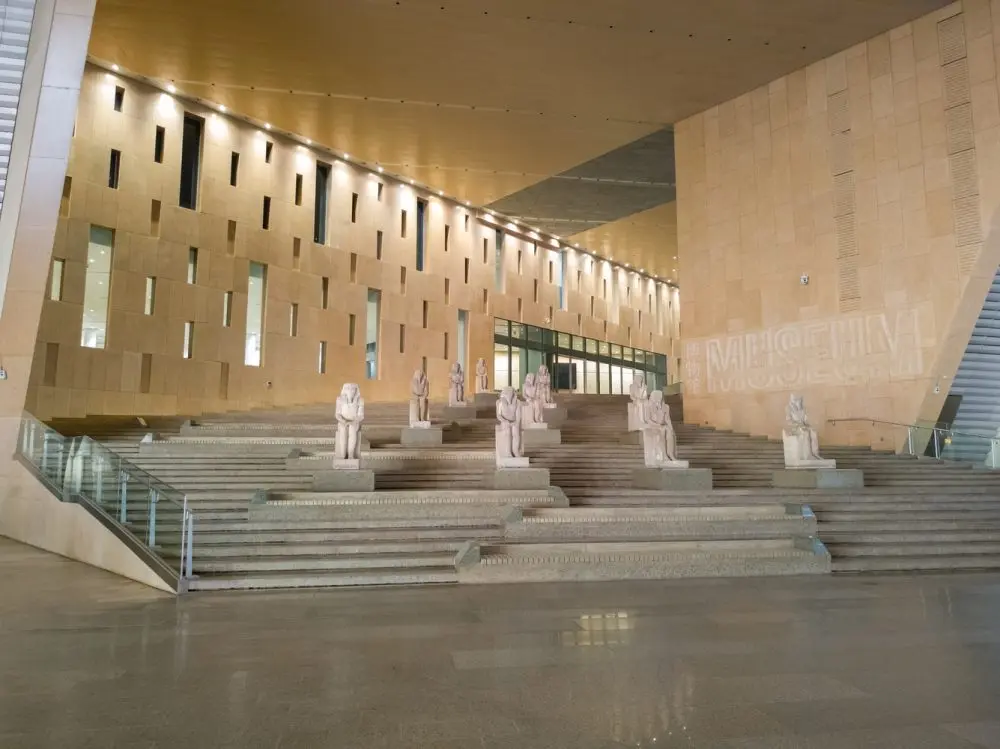 Visitors enter through a vast glass atrium framing desert views and dominated by a colossal statue of Ramses II weighing 83 tons. From there, a grand staircase leads to the main galleries.