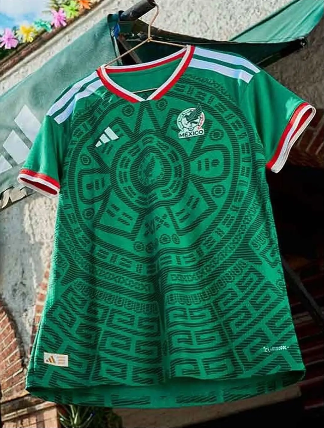 The design closely resembles the 1998 France World Cup kit, which also featured the Aztec Sun Stone motif. In Mexico’s previous home World Cups (1970 and 1986), the team wore green jerseys with simple white details on the collar and sleeves.