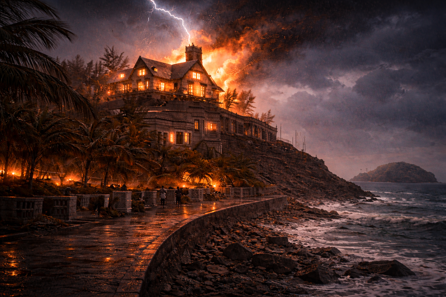 On September 12, 1944, a violent storm struck Mazatlán. A lightning bolt hit the Quinta’s lightning rod—but due to a failed grounding system, the electric discharge ignited the wooden structure. Fire spread rapidly through the upper levels, consuming roofs and interiors.